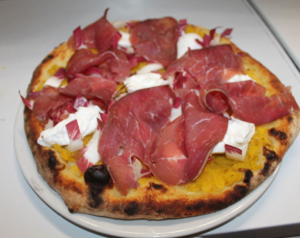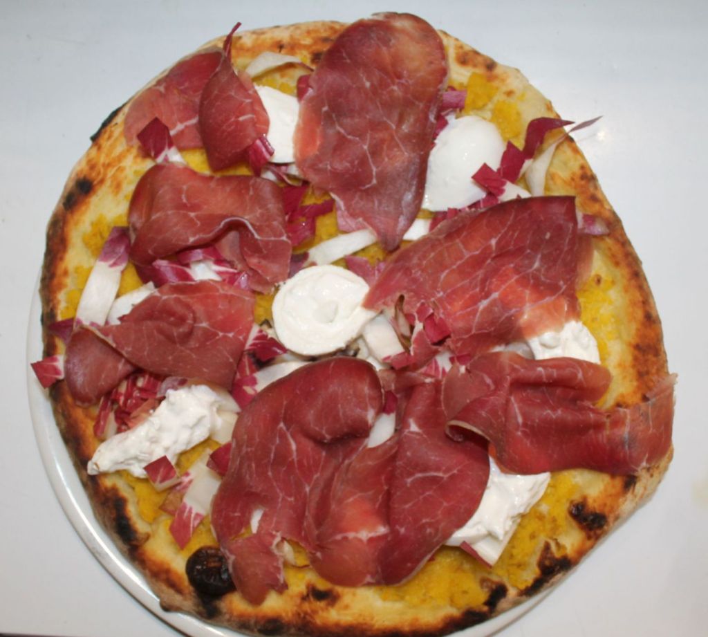 Burrata e bresaola della Valtellina IGT su crema di carote viola o arancione o gialle e radicchio trevigiano